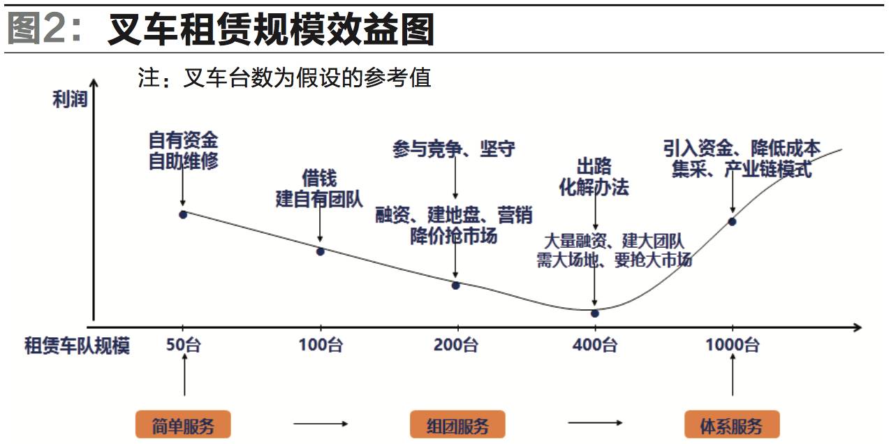 對(duì)于叉車租賃業(yè)務(wù)的發(fā)展,劉世宏提醒相關(guān)企業(yè)要注意兩點(diǎn):首先,規(guī)模效益,即叉車租賃企業(yè)在不同的租賃車隊(duì)規(guī)模階段,需要采取不同的發(fā)展策略和能力支撐。其次,服務(wù)升級(jí)。目前市場(chǎng)上已知的叉車租賃服務(wù)可依據(jù)對(duì)金融的利用程度分為初級(jí)型服務(wù)、簡(jiǎn)單型服務(wù)、復(fù)合型服務(wù)和創(chuàng)新型服務(wù)。